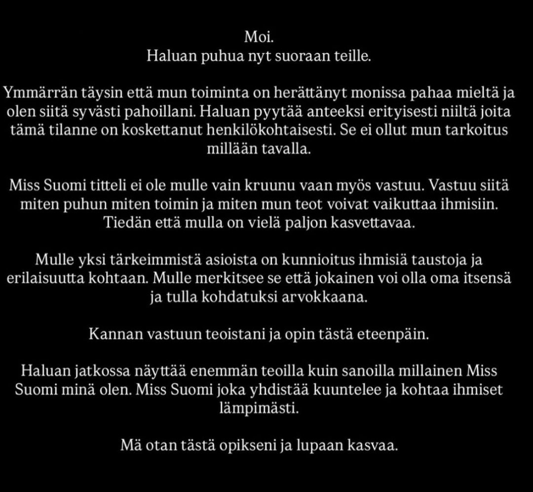 小姐的芬兰分部官方在一周内持续回应此事,发布了多篇道歉声明,重申了选美比赛的价值观,称绝不接受任何形式的种族主义或歧视行为。