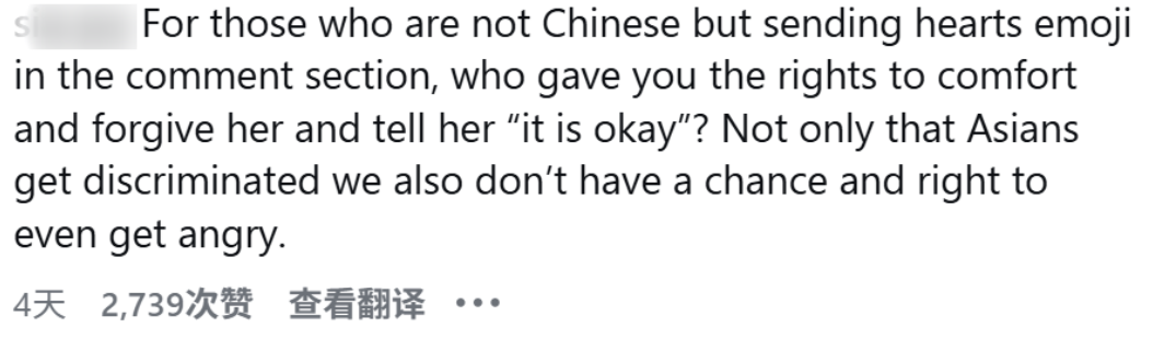 “致那些不是中国人但是在评论发送爱心表情表示谅解的人:到底是谁给了你原谅她、安慰她的权利??